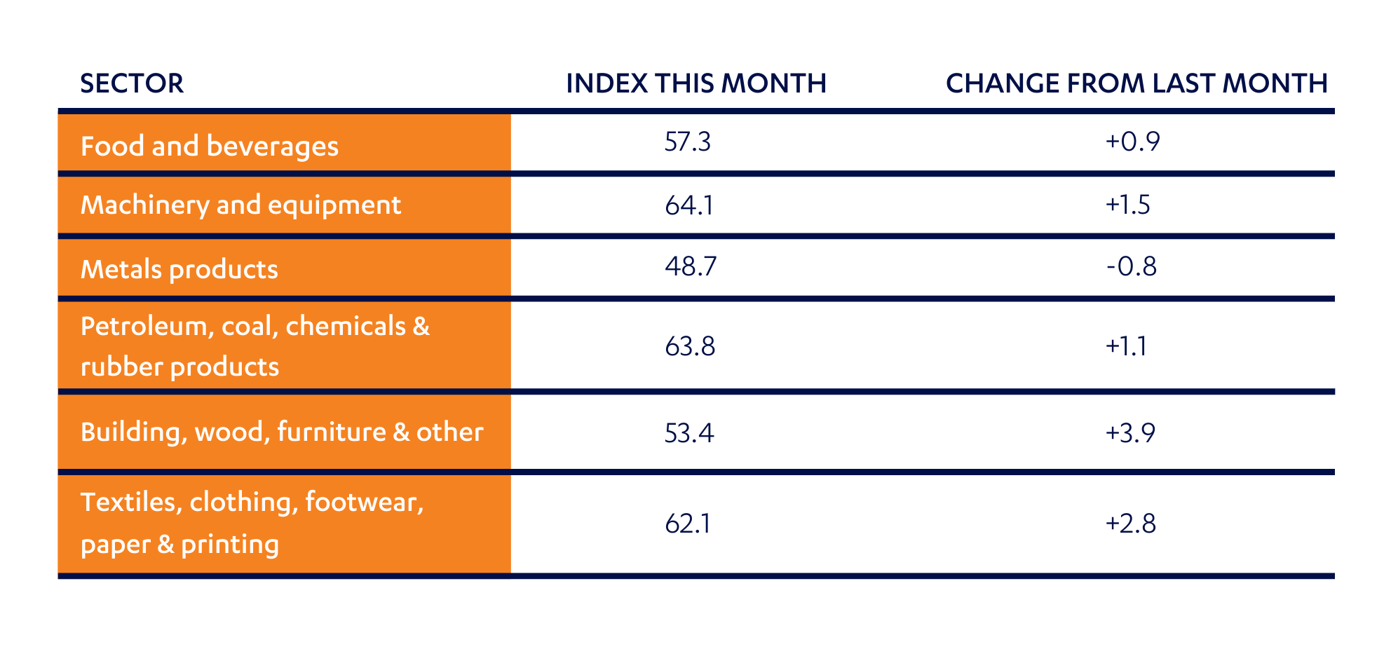 The following table shows the performance of each sector in Australia’s manufacturing industry.